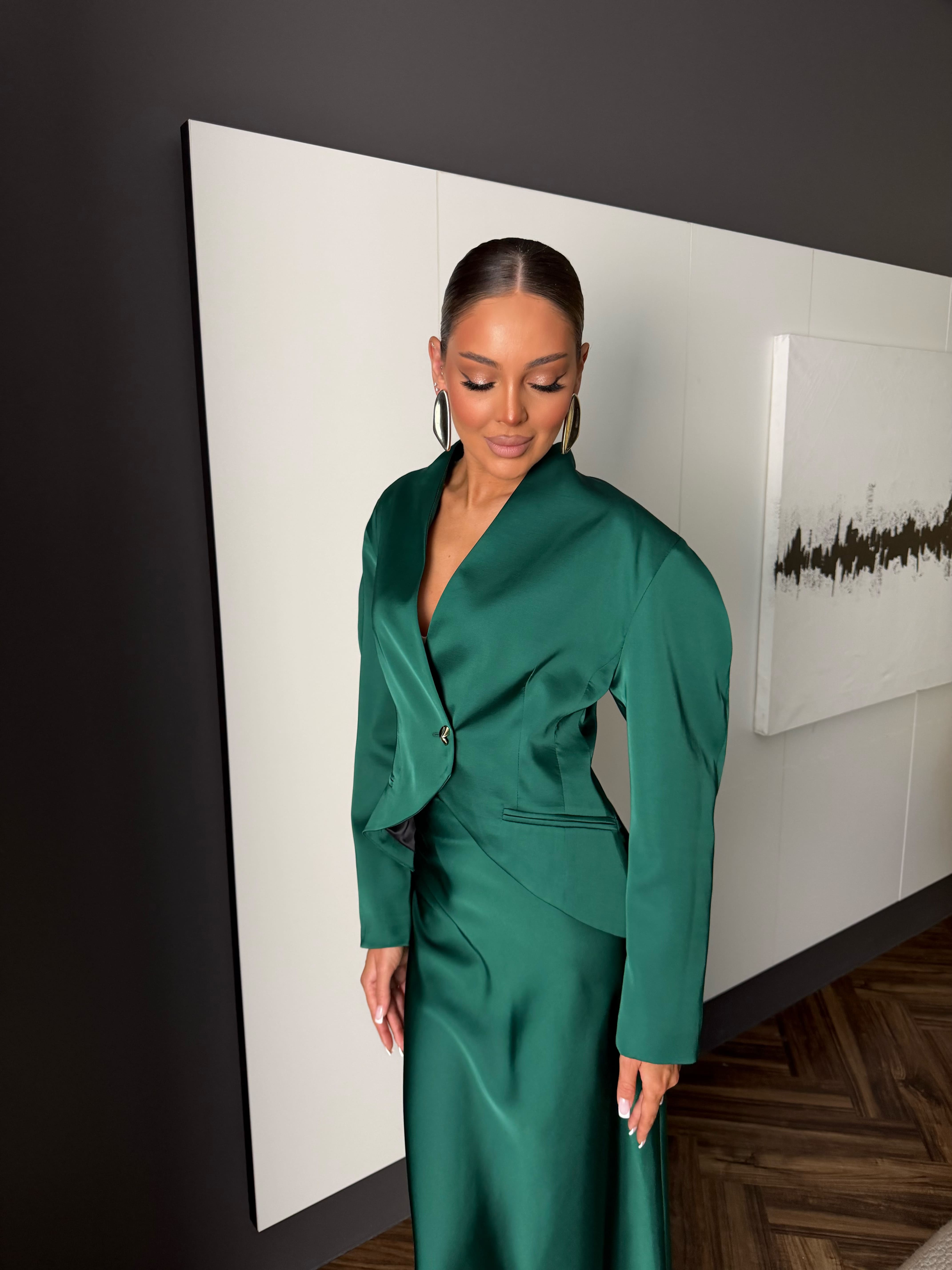 Трендовая новинка сезона в самом женственном исполнении от KMK. Юбка длины макси, из атласной вискозы изумруд. У юбки потайная молния сбоку.