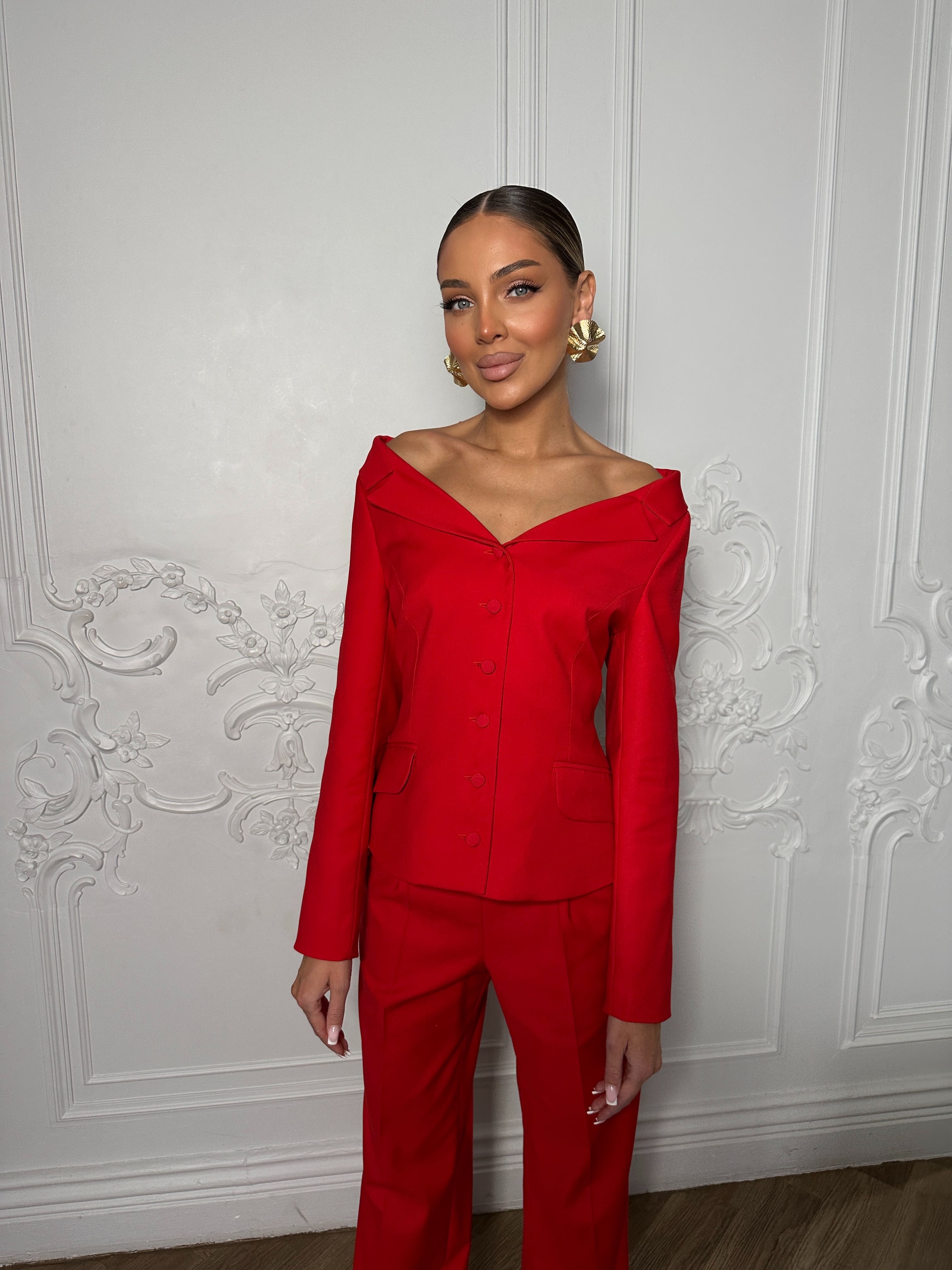 Комплект из жакета с открытыми плечами и брюк-палаццо. Жакет приталенный на пуговицах в тон с открытыми плечами, жакет выполнен полностью на подкладе из поливискозы. Брюки-палаццо с завышенной посадкой на талии.