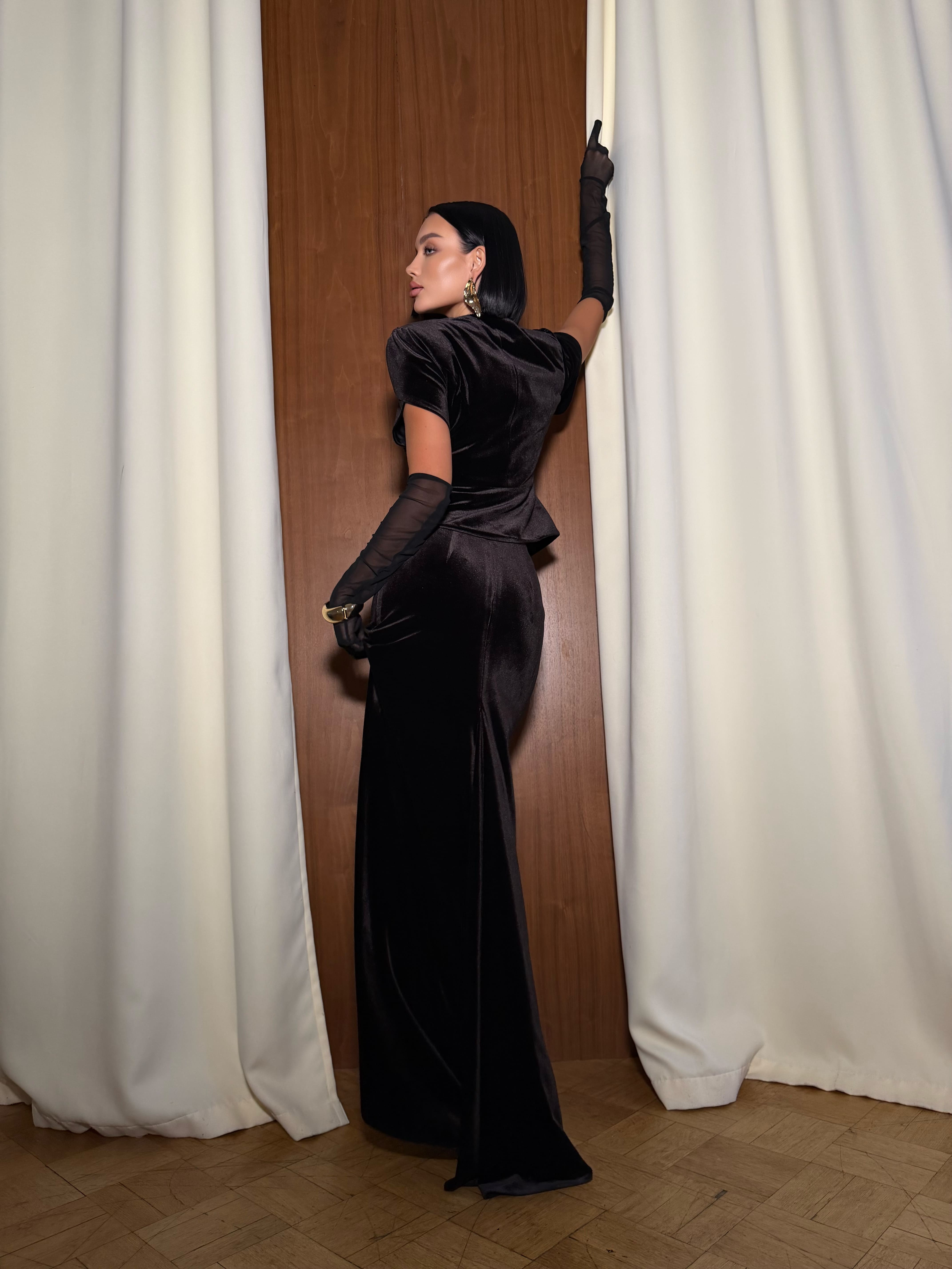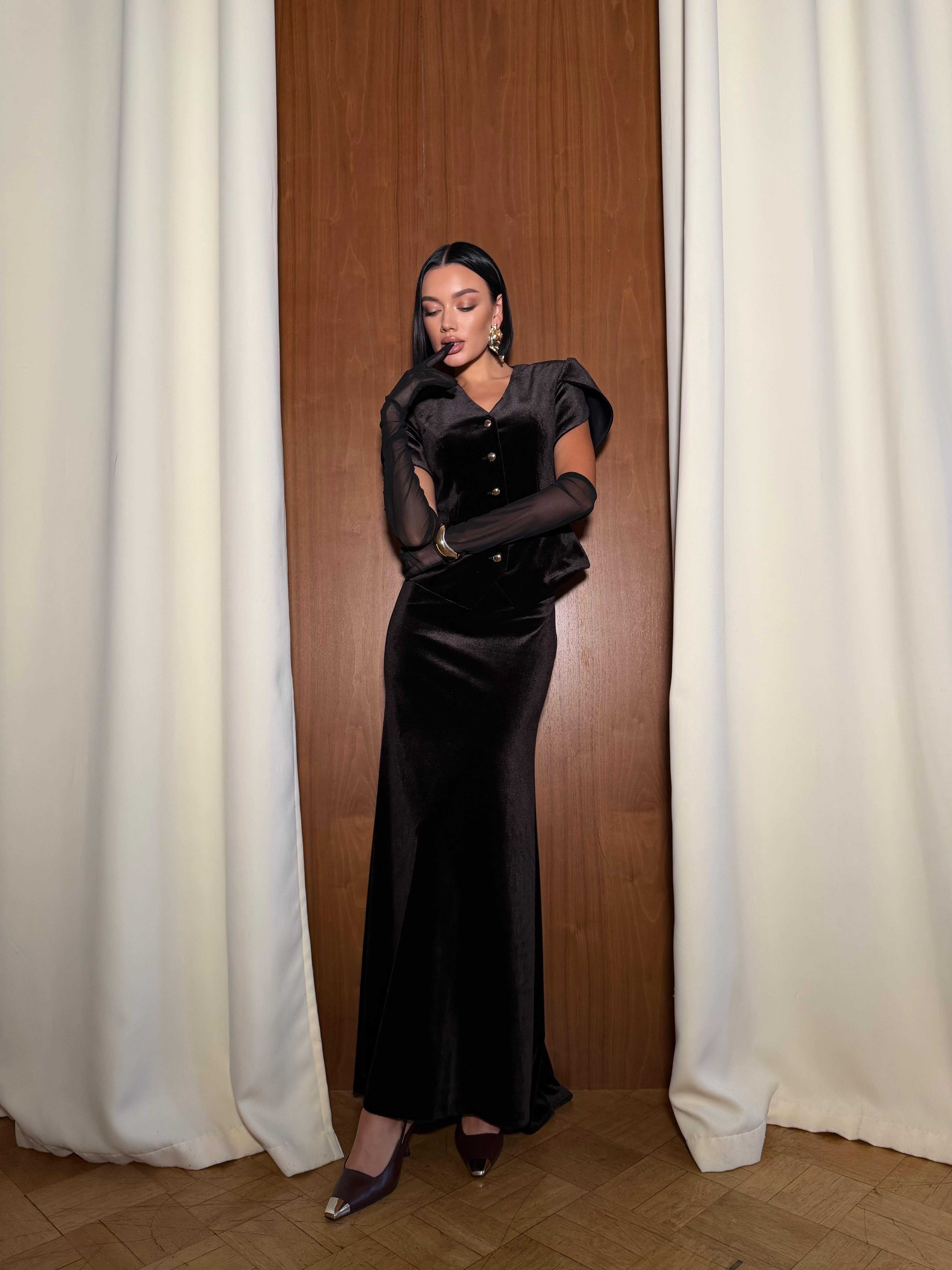 Комплект из жакета с рукавами лепестки и юбки-русалки из бархата. В комплекте к жакету идет шарф. Тренд 2026. Жакет выполнен полностью на подкладе из поливискозы. Юбка с посадкой на талии и застежка в виде потайной молнии.