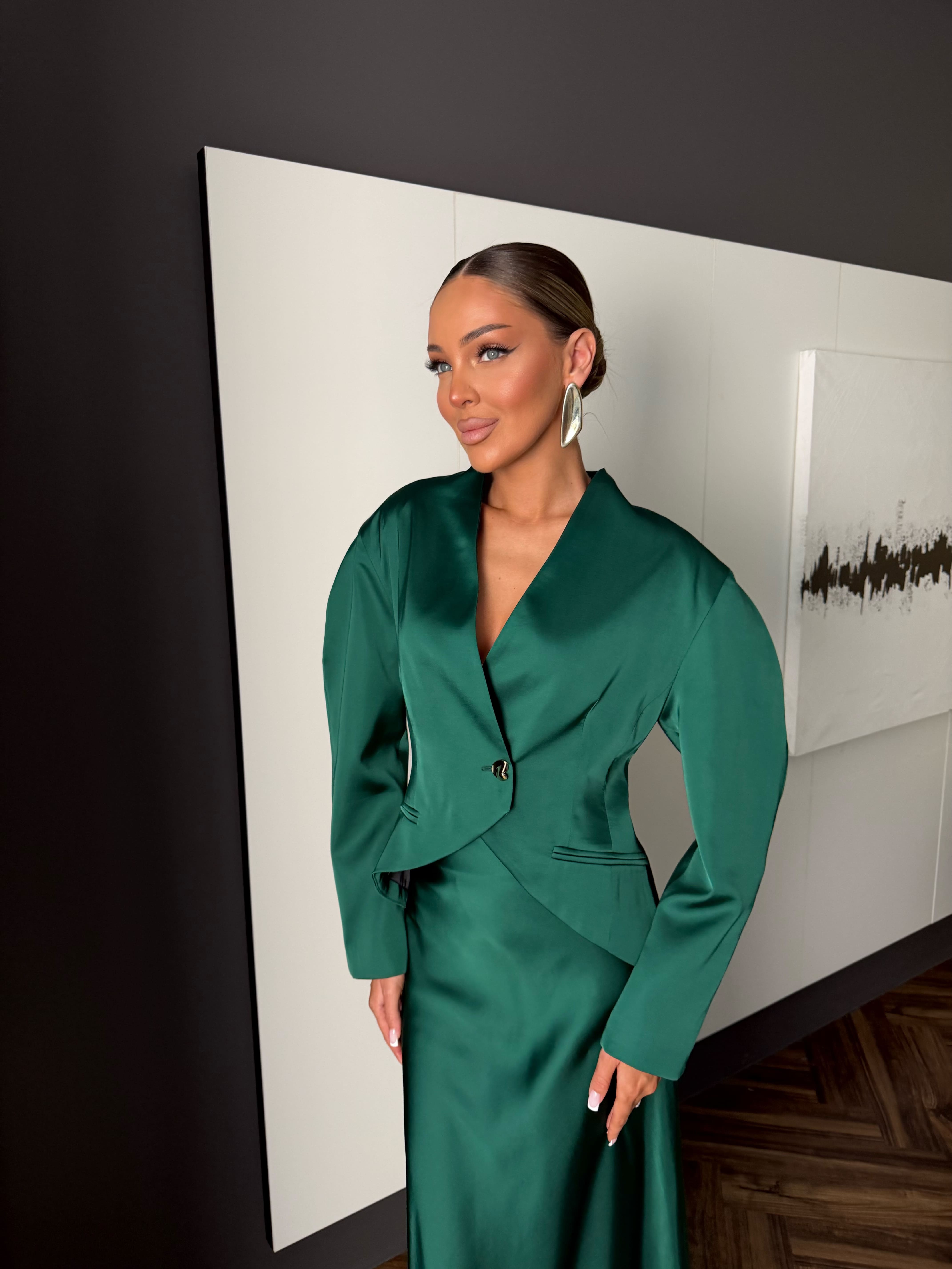 Комплект из жакета и юбки из атласной вискозы. Интересный крой изделия жакета, застежка на одну пуговицу. Юбка-макси по косой.