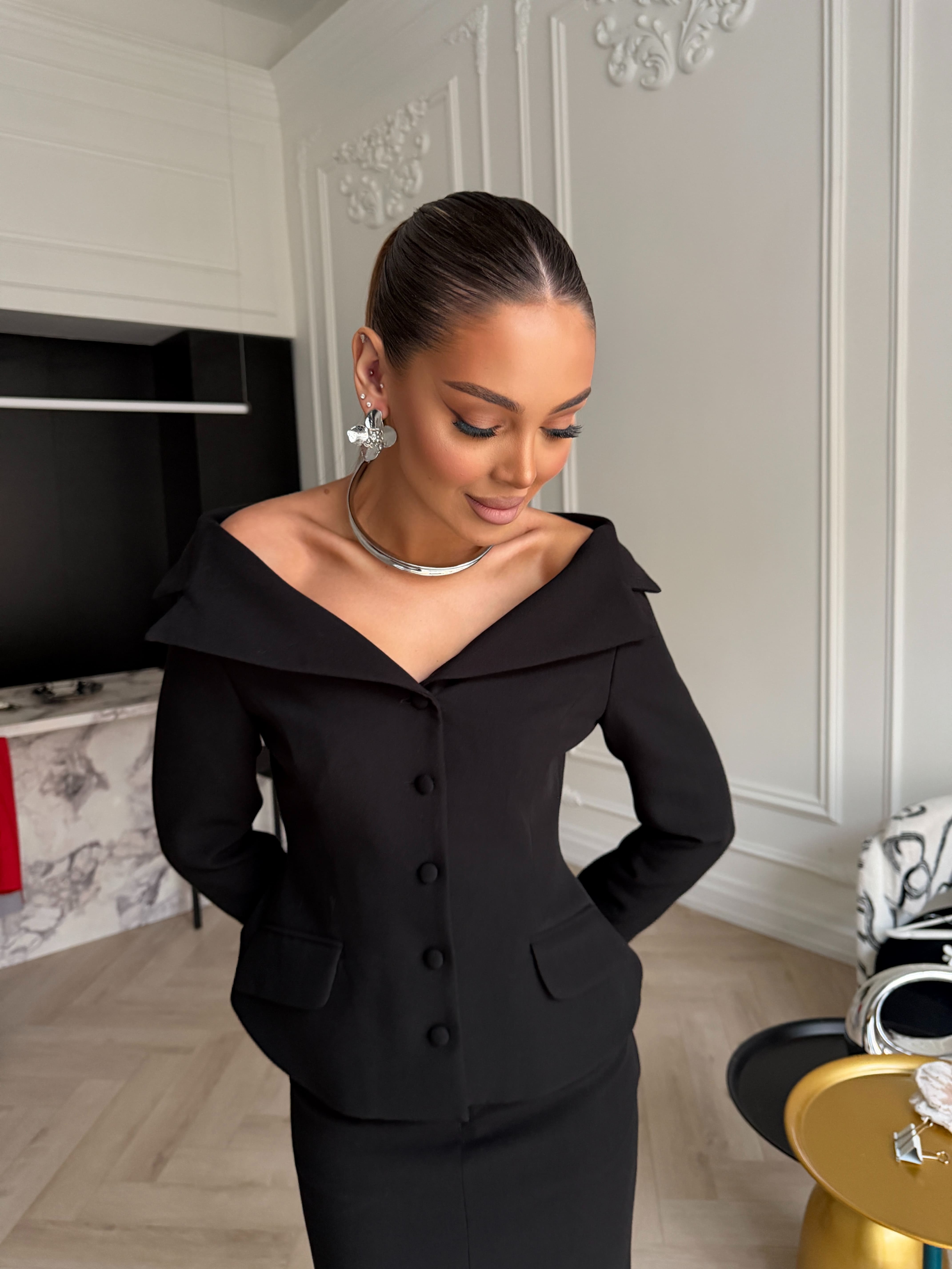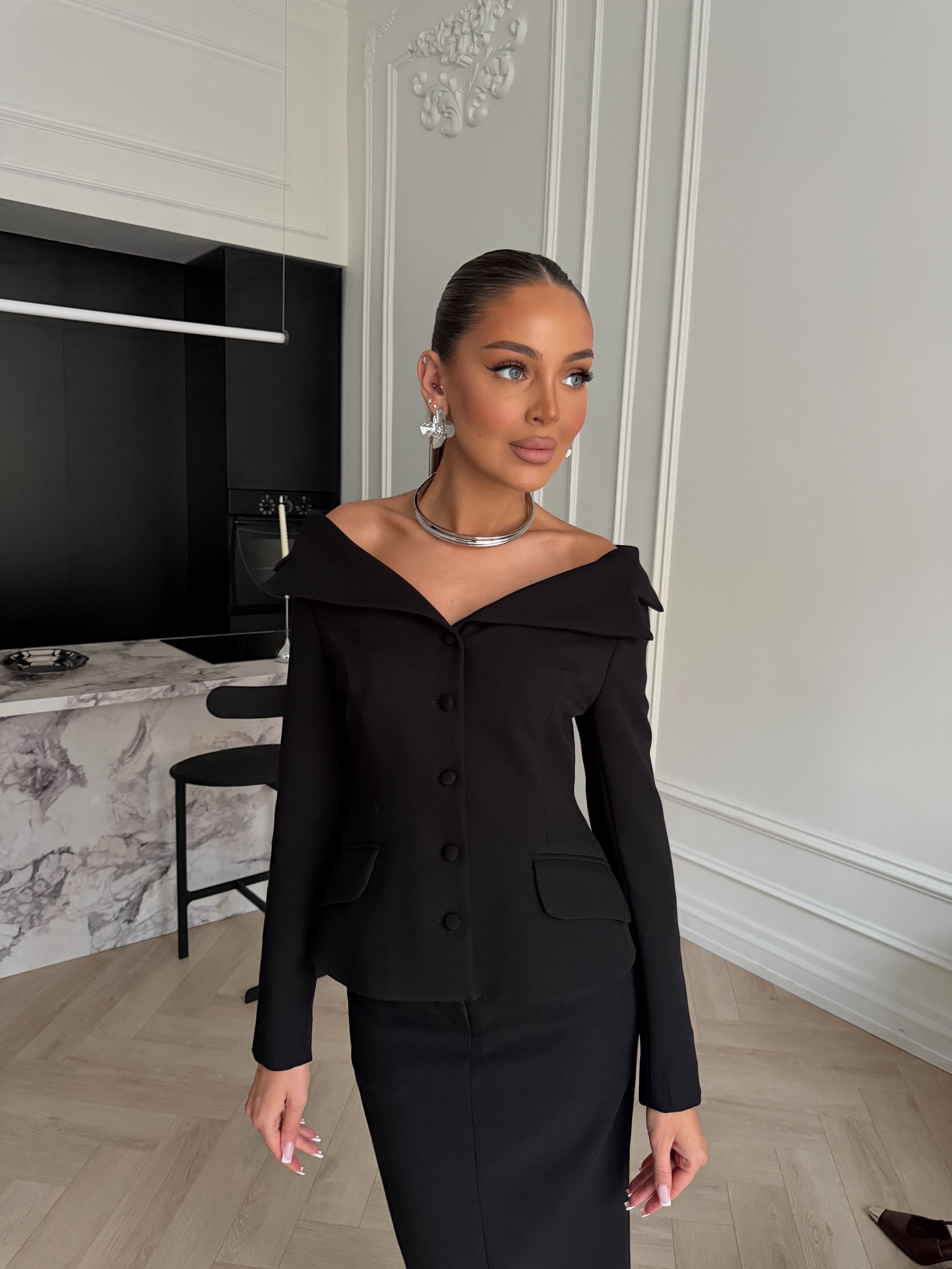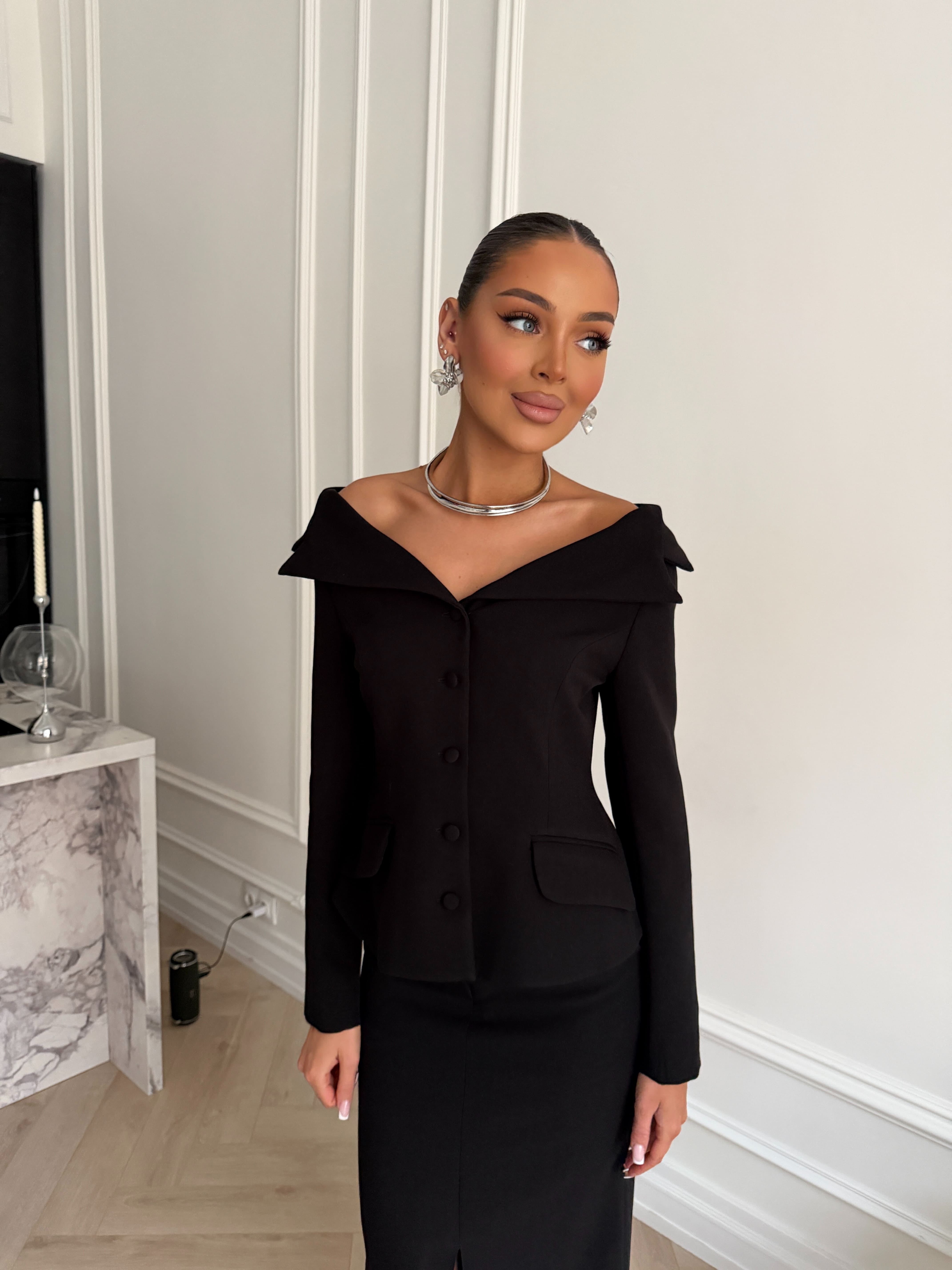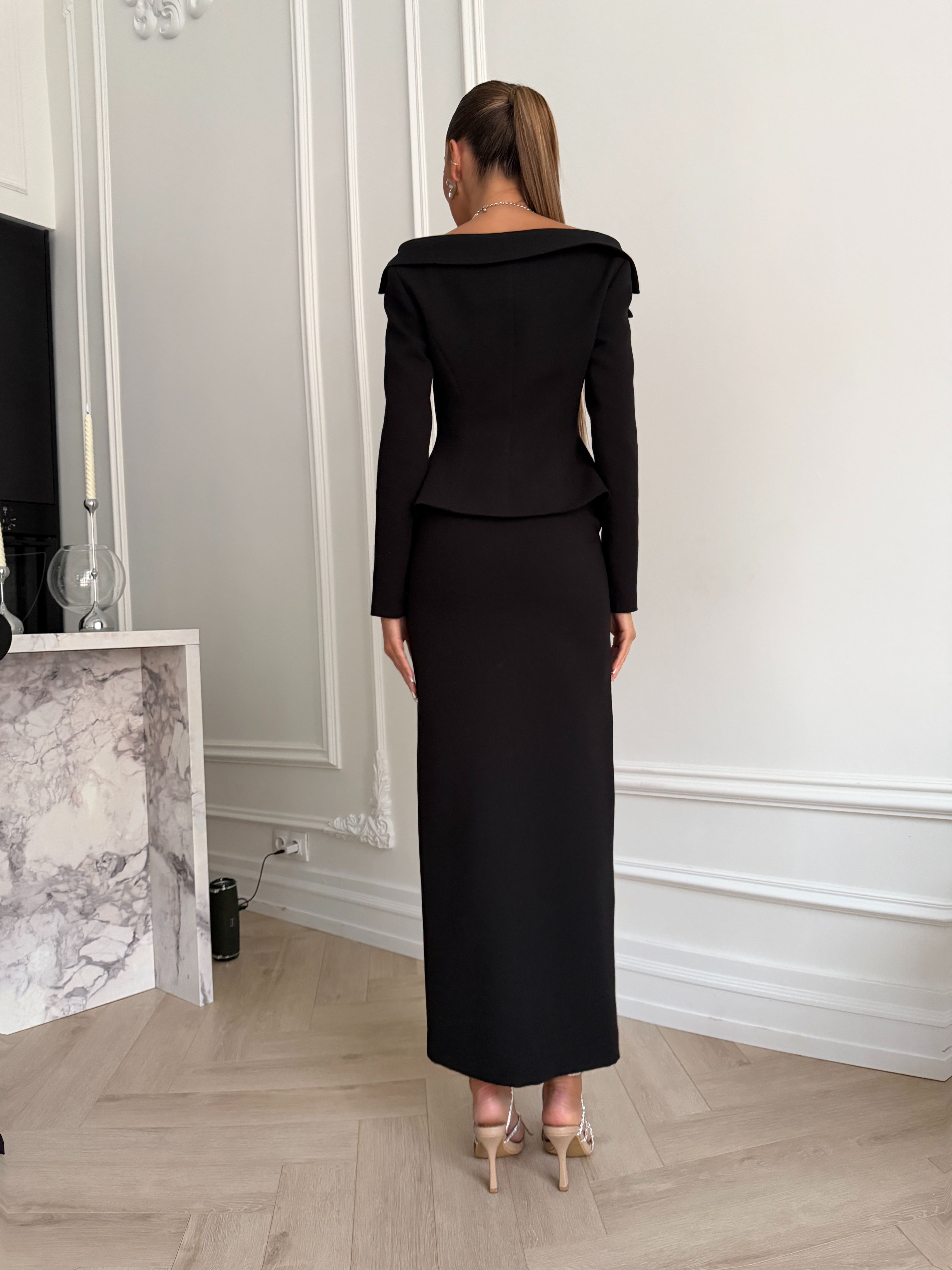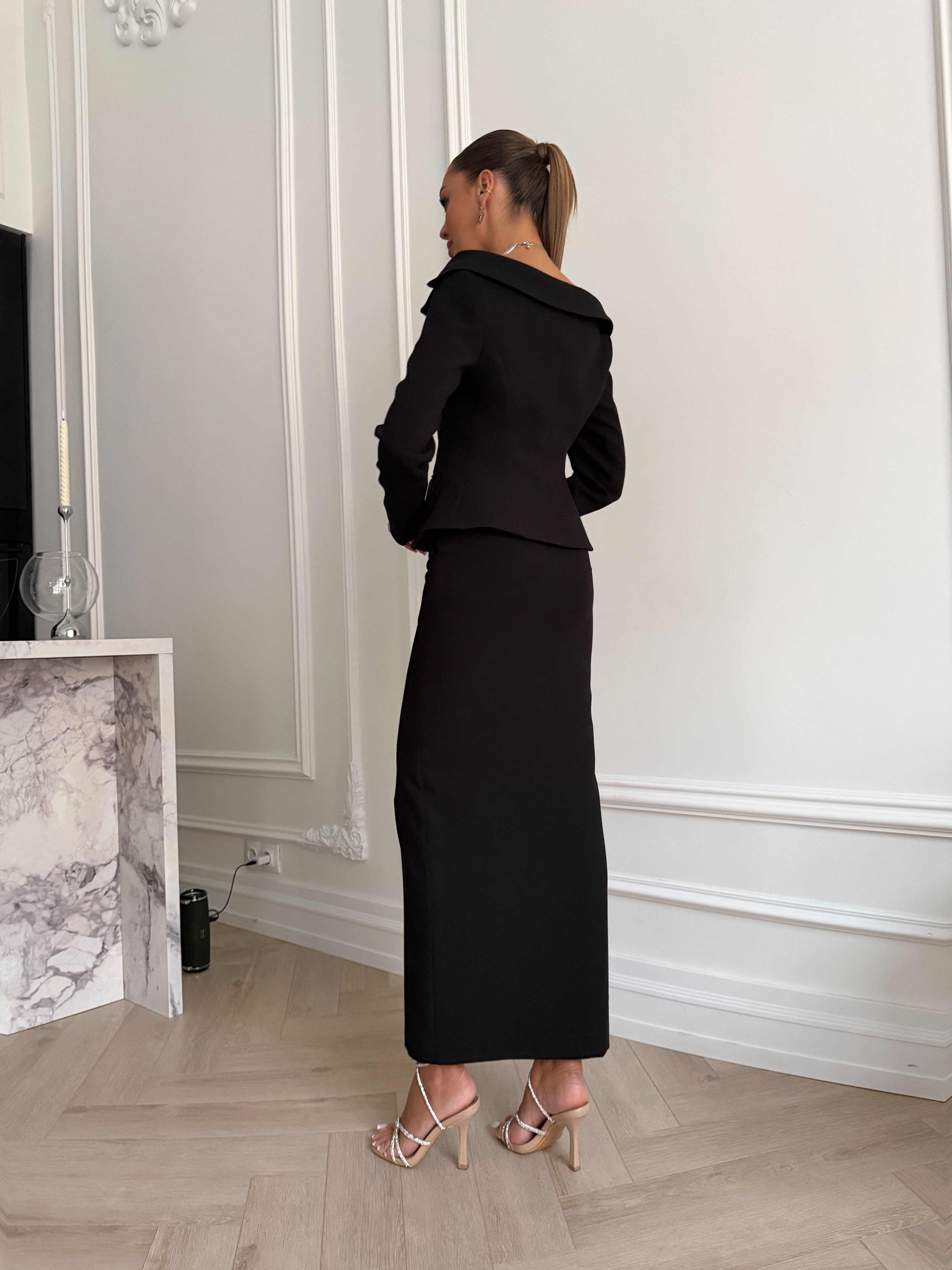 Комплект из жакета с открытыми плечами и юбки-макси с разрезом. Выполнены полностью на подкладе.