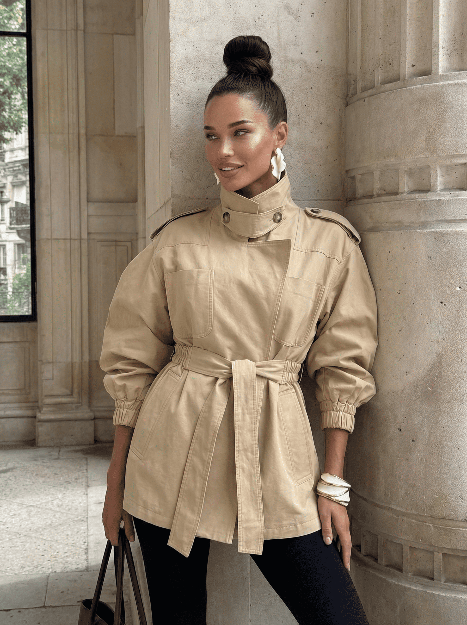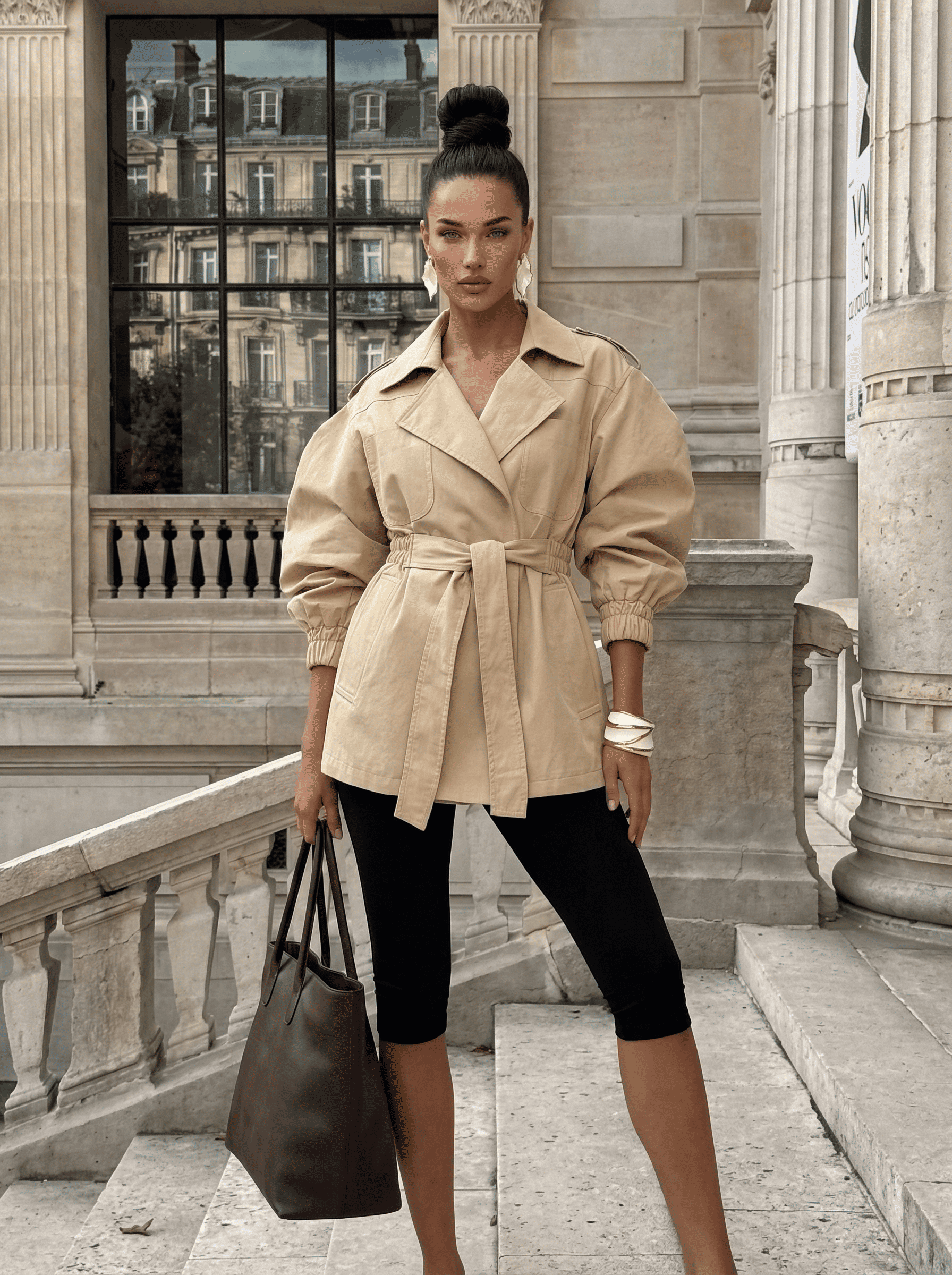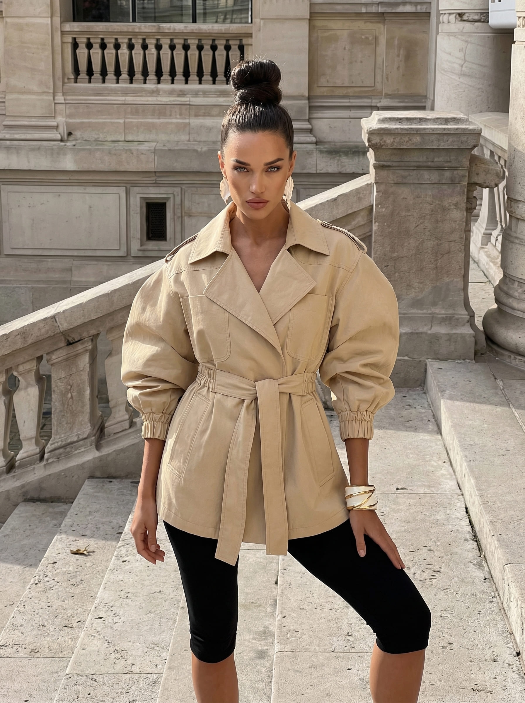 Дизайнерский тренч собственного производства. Дыщащий хлопковый материал с водоотталкивающий пропиткой на подкладе из поливискозы. Тренч можно носить 2 способами: с воротником или без. Тренч вырисовывает силуэт песочные часы с акцентом на талии благодаря поясу-резинке. Рукава трендового силуэта.